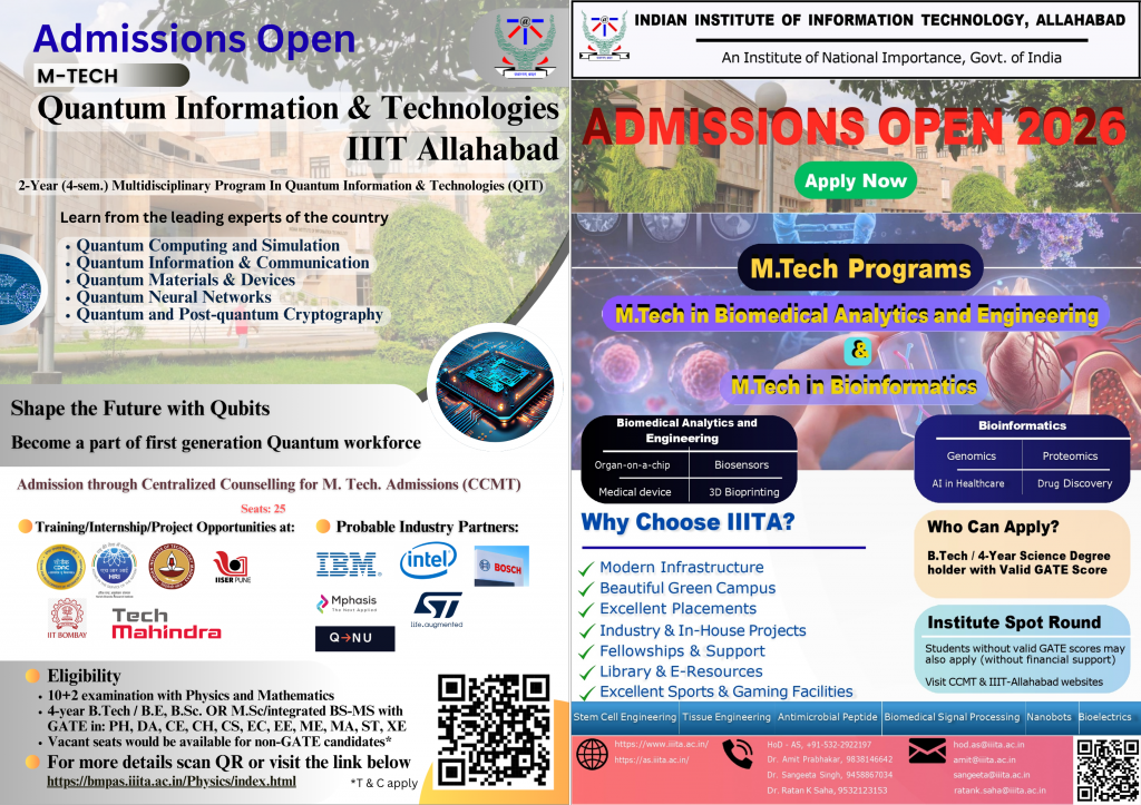 The department offers multiple core courses in Physics, Mathematics, Biology, and Statistics for B. Tech. programs running at IIIT Allahabad. The department also offers several elective courses and minors in the areas of Physics, Mathematics, and Bioengineering. The department offers M. Tech. courses in Bioinformatics and Biomedical Analytics & Engineering. The department consists of three major disciplines-> click here: