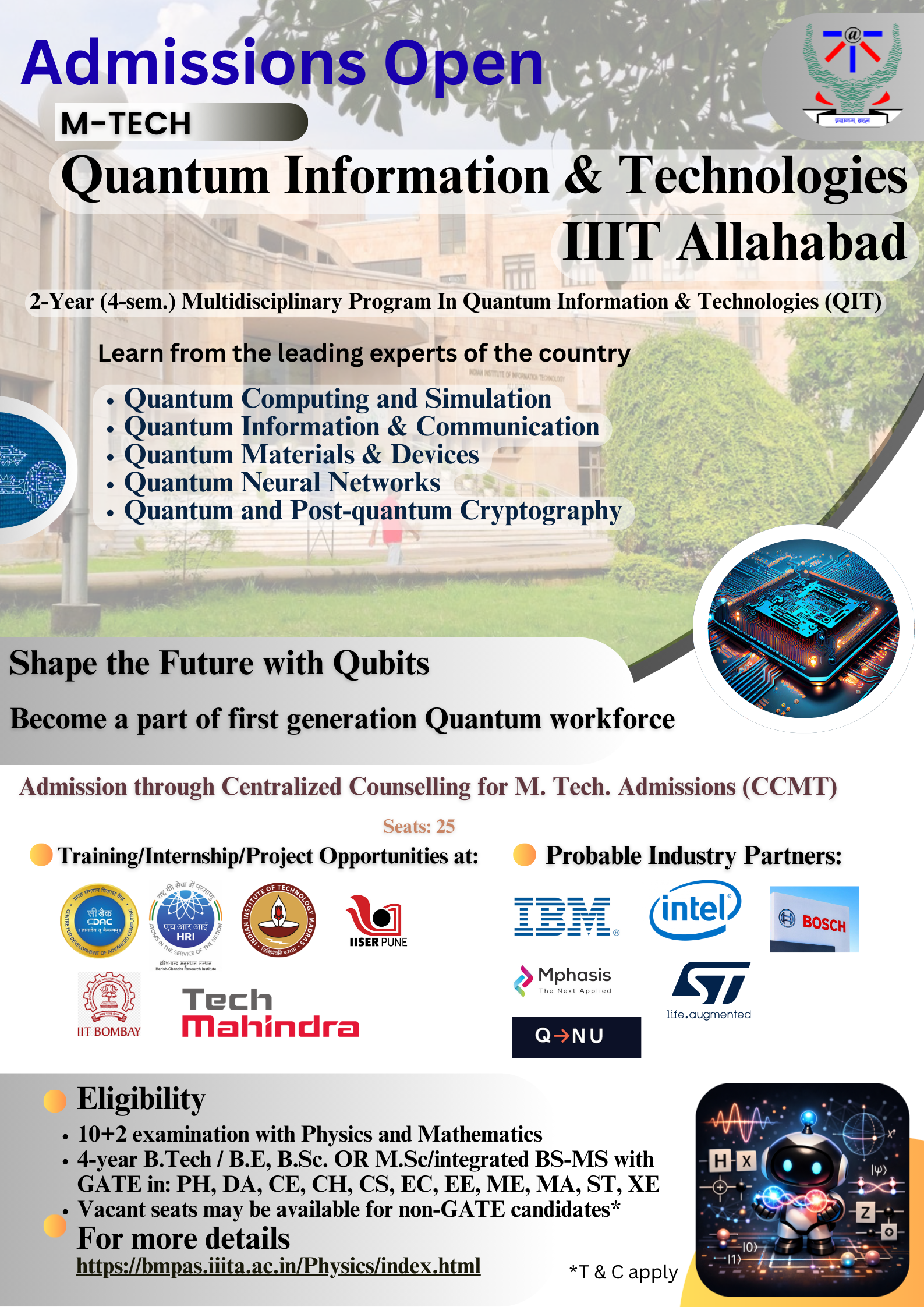The Master of Technology (M.Tech) programme in Quantum Information Technologies (QIT) is a four-semester programme aimed at preparing students for advanced research and high-technology industry roles. The programme is intended for candidates with academic backgrounds in physical sciences or mathematical sciences. Applicants holding a Master’s degree in basic sciences, with Physics and/or Mathematics as a core subject, or a Bachelor’s degree in Technology/Engineering in relevant allied disciplines are eligible to apply. Candidates must have obtained the minimum Cumulative Performance Index (CPI) as prescribed in the admissions criteria and possess a valid GATE score; candidates appearing in the final examination of the qualifying degree are also eligible to apply.